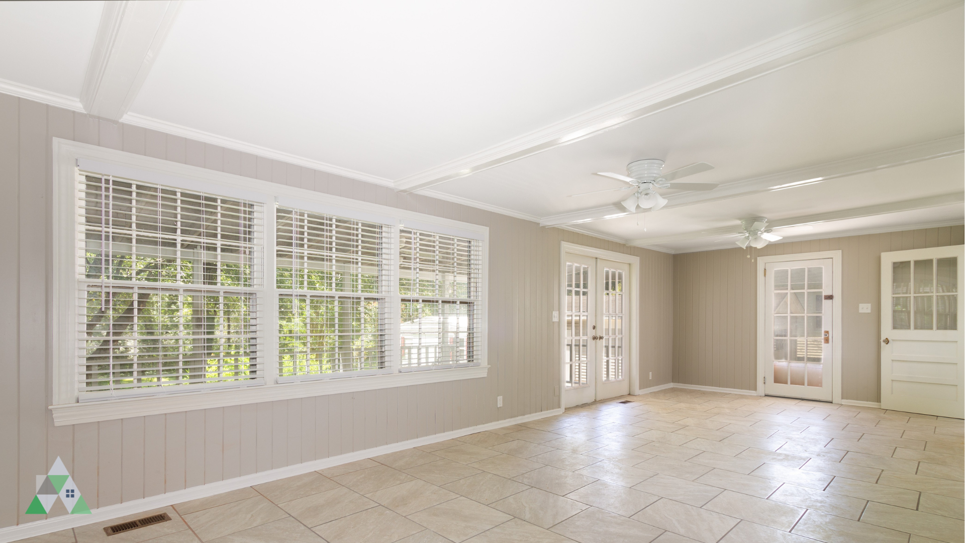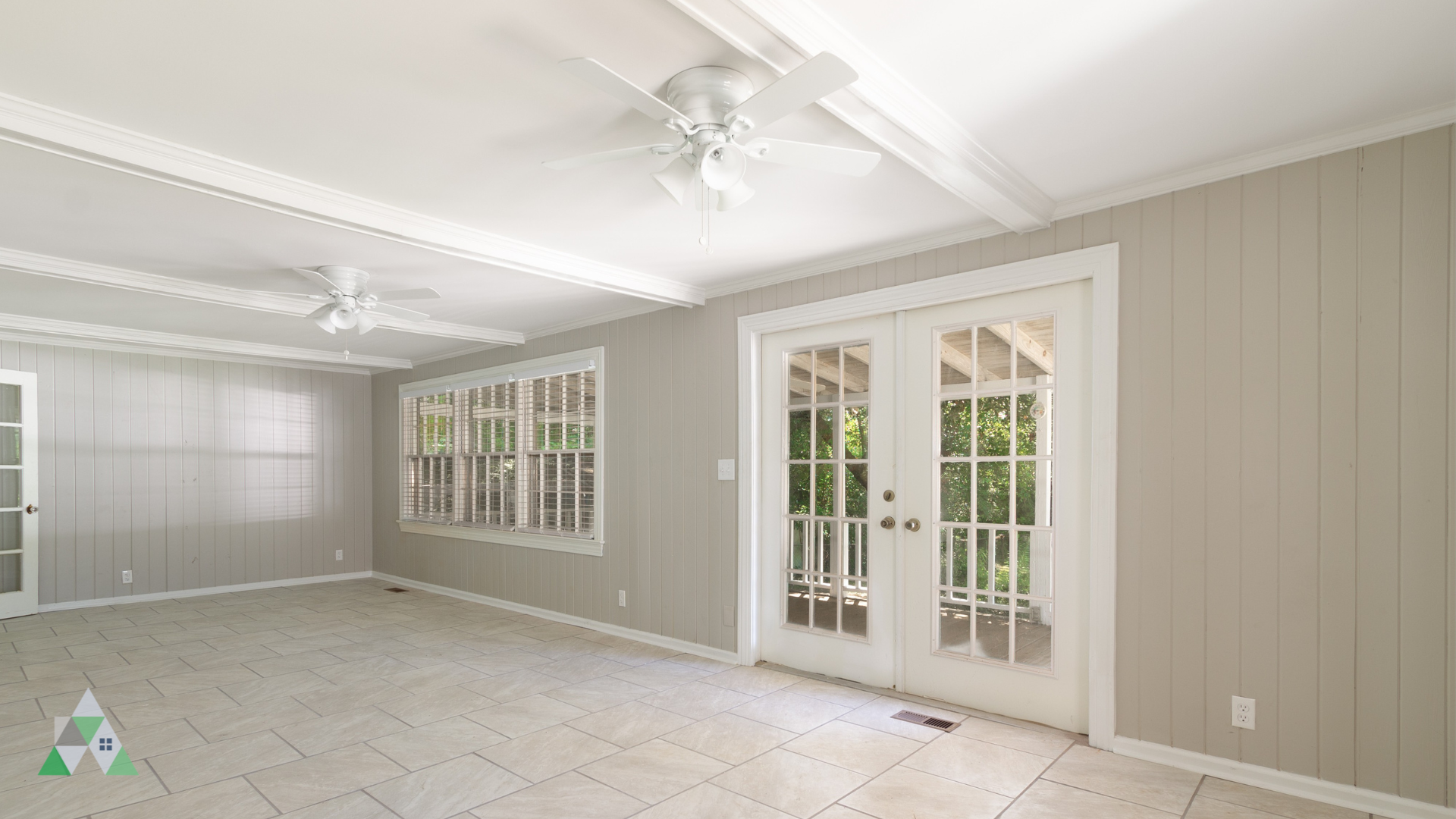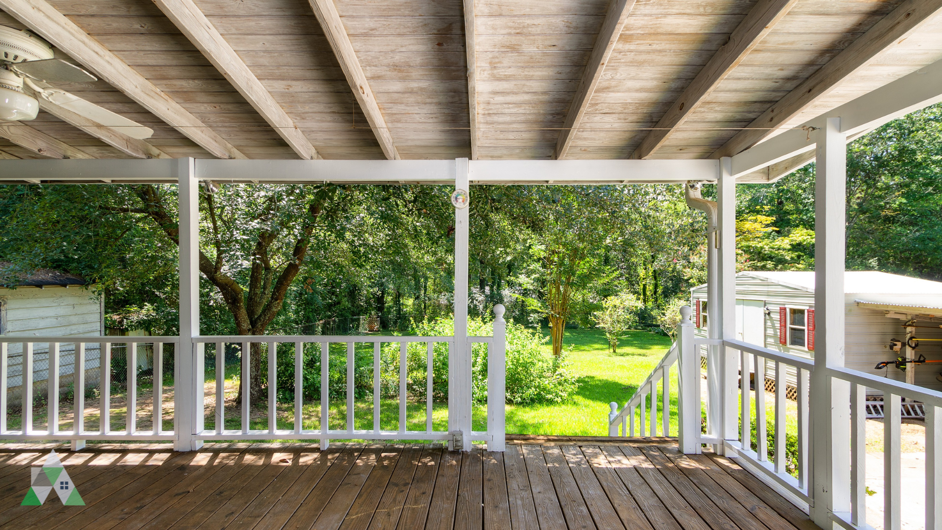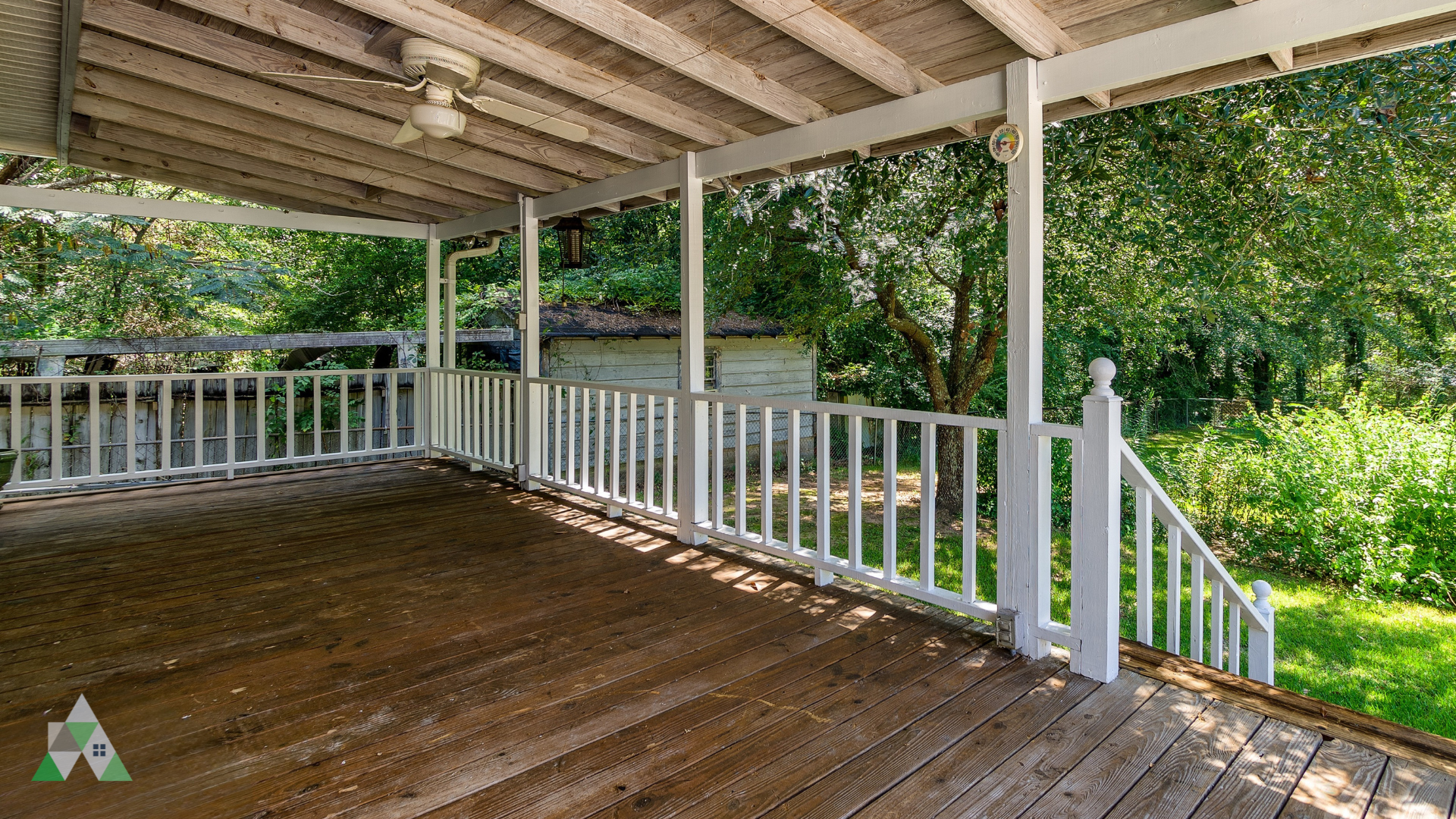From the wide, spacious family room at the back of the house, venture out through French doors onto the large covered back porch overlooking a gorgeous fenced-in backyard.